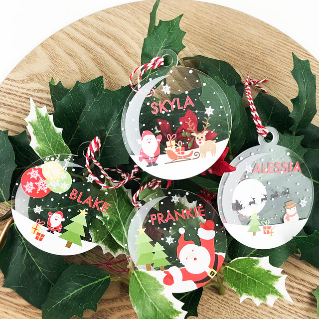 These printed ornaments are made from clear acrylic and UV inks. The ornament measures approximately 7.5cm w x 9cm h and are 2mm thick. It also comes with red and white twine so it is ready to hang!