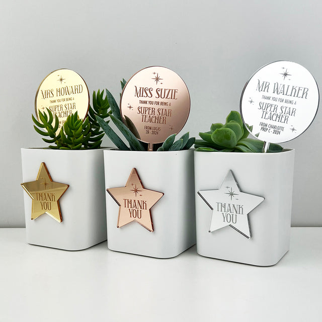 A perfect personalised addition to a pot plant and for the front of the pot, for a unique teacher gift. The planter stem is personalised with your details and the 'thank you' star is added in to compliment the stem in the pot plant.