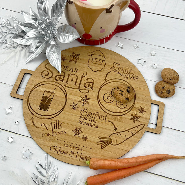 Leaving some treats out for Santa and his reindeer the night before Christmas is such a beautiful childhood tradition for little ones. Our bamboo board is perfect for leaving a personalised message, along with some cookies and milk for Santa, when he visits in December. There's even a place for a carrot for the reindeer. And we have added handles to make it easier for little hands to carry!