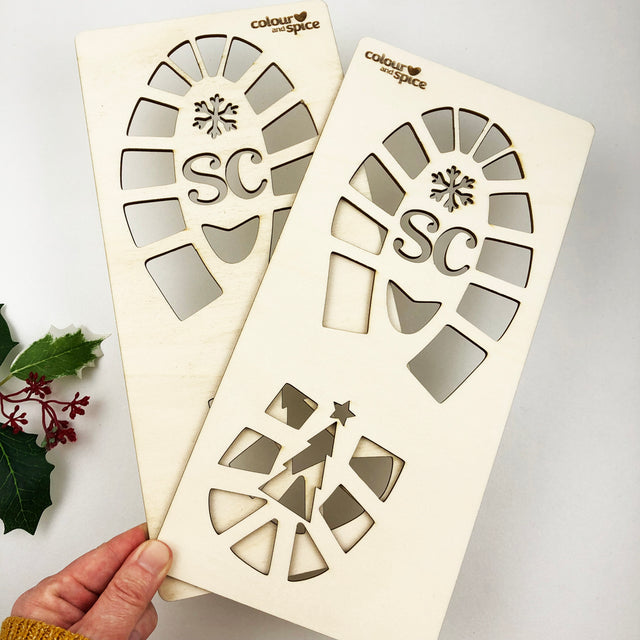 Our cute Santa Boots stencil, with both the left and right foot in the set, is made from plywood, and it can be used year after year. The boot shape measures approximately 12cm w x 28cm long, so is the real size of Santa's boots!