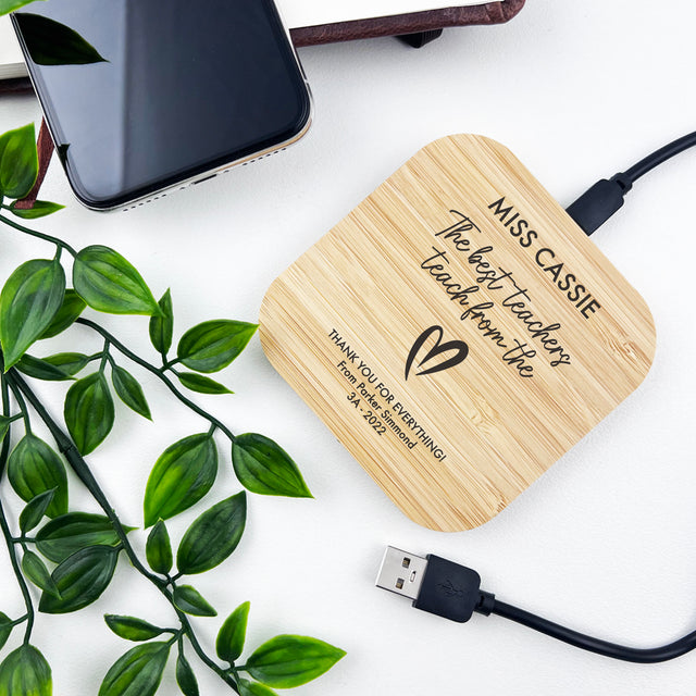 Our ultra slim personalised fast wireless mobile bamboo phone charger makes a unique and practical gift for anyone with a mobile phone, and perfect for teacher gifts. Personalise it to give the ultimate practical gift.